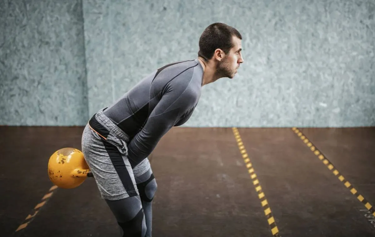 - نفس بکشید و کتل بل را سریع به عقب بکشید تا زمانی که مچ دست بین ران قرار گیرد و کتل بل کمی در پشت پاها، نزدیک باسن قرار گیرد.