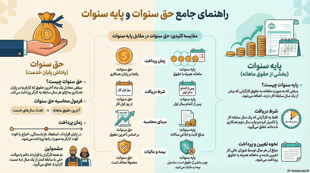 حق سنوات مبلغی است که معمولا در پایان همکاری و یا اتمام قرارداد به صورت یکجا به کارگر پرداخت می شود و از همان روز اول شروع به کار محاسبه می شود. اما پایه سنوات مبلغی است که فقط به کارگرانی که حداقل یک سال سابقه کار دارند تعلق می گیرد و هر ماه همراه با حقوق پرداخت می شود.